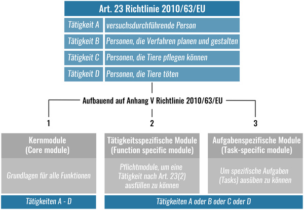 Hintergrund der modularen Struktur ist, dass im Zuge der Umsetzung der EU Tierschutzrichtlinie (Richtlinie 2010/63/EU) Empfehlungen bezüglich der versuchstierkundlichen Ausbildung entworfen wurden (Aus- und Fortbildungsrahmen). Diese sehen vor, dass alle Personen, die Tätigkeiten nach Art. 23 (2) RL 2010/63/EU durchführen, bestimmte Kernkompetenzen besitzen müssen, um die jeweiligen Tätigkeiten (engl. Functions) ausüben zu dürfen. Dies betrifft nach Art. 23 (2) Personen die